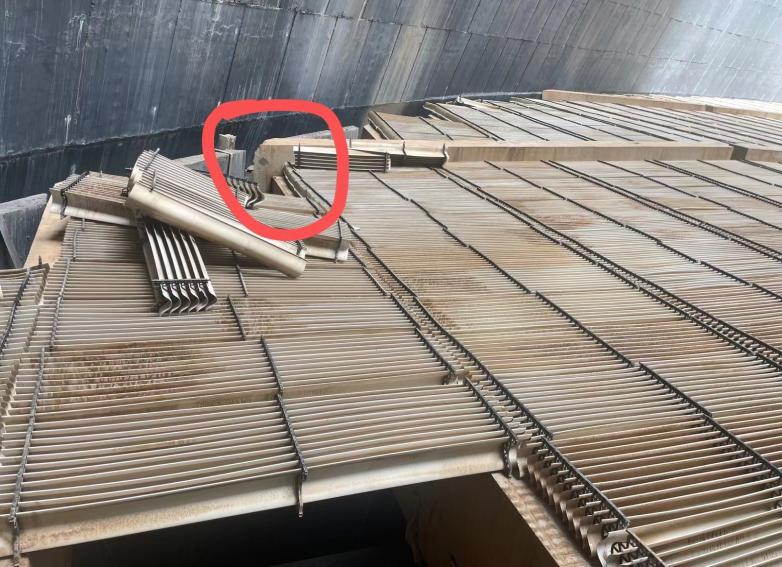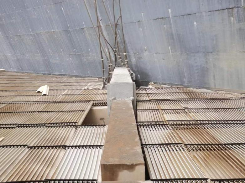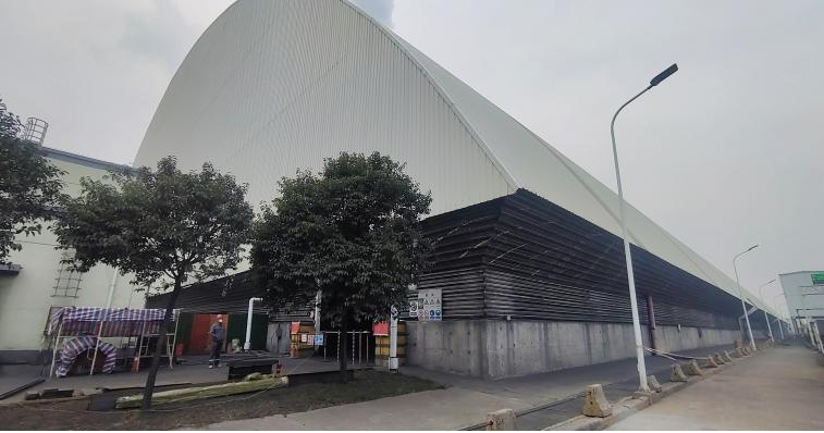 本工程于2024年实施,项目位于河南省郑州市巩义市大唐巩义电厂内,原干煤棚结构形式为钢网架,网架纵向柱网8m,纵向总长为284m,在居中位置设置结构缝,横向跨度120m,总占地面积约35385m2,网架内净空最大高度约36.85m,总高度约40.25m。干煤棚于2016年建设投产,期间一直作为干煤储煤棚,由于北侧的基础发生不均匀的沉降,导致部分支座沉降,其中29/K轴支座最大沉降量达到100mm,带动网架支座也发生沉降,造成上部网架部分杆件发生弯曲变形,存在安全隐患。