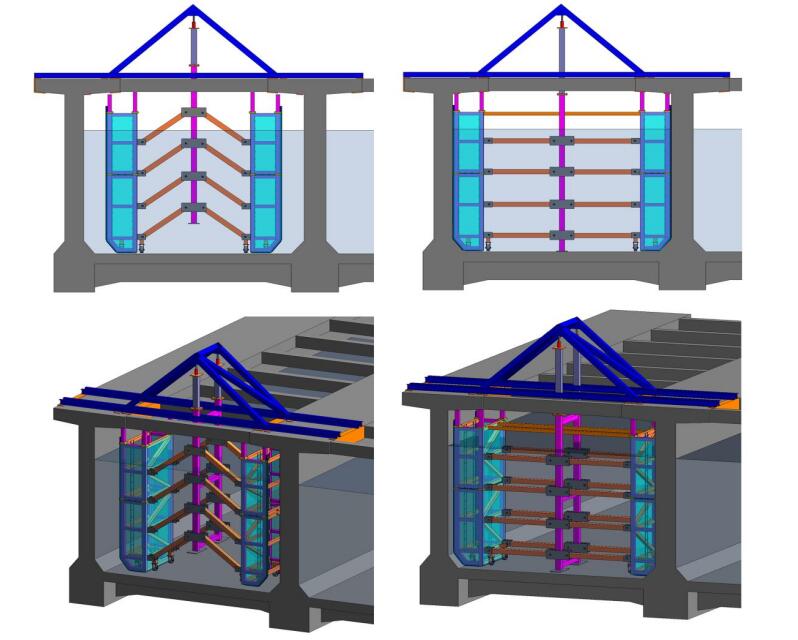 针对大型渡槽结构不中断输水施工,sunbet申搏官方网站研究开发了渡槽施工专用围堰,通过可伸缩结构将两侧隔水箱连接,吊装入水后张开贴紧侧壁,通过高压水带形成密封隔水,再两侧隔水箱内水排干,形成干地作业环境,由此通过中间过水,两侧即可进行侧壁修复。对于止水带修复的情况,可先更换两侧隔水箱区域止水带,再结合隔水膜将中间区域隔水,两侧过水,将中间区域形成干地作业环境。通过底部行走轮和侧面限位轮,可通过牵引系统将隔水装置在水下进行牵引行走,可做到连续施工。