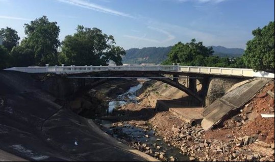 项目概况:国电江西电力有限公司万安水力发电厂生活区南河桥是一座单跨上承式单波双曲拱桥。为了解南河桥的结构现状,判断桥梁结构承载能力是否满足安全通行进出厂重载车的荷载要求,2018年7月,中国国电集团江西电力有限公司万安水力发电厂委托我公司技术人员对本桥进行现场检测及静、动载试验,为后期桥梁使用、养护和加固提供依据。