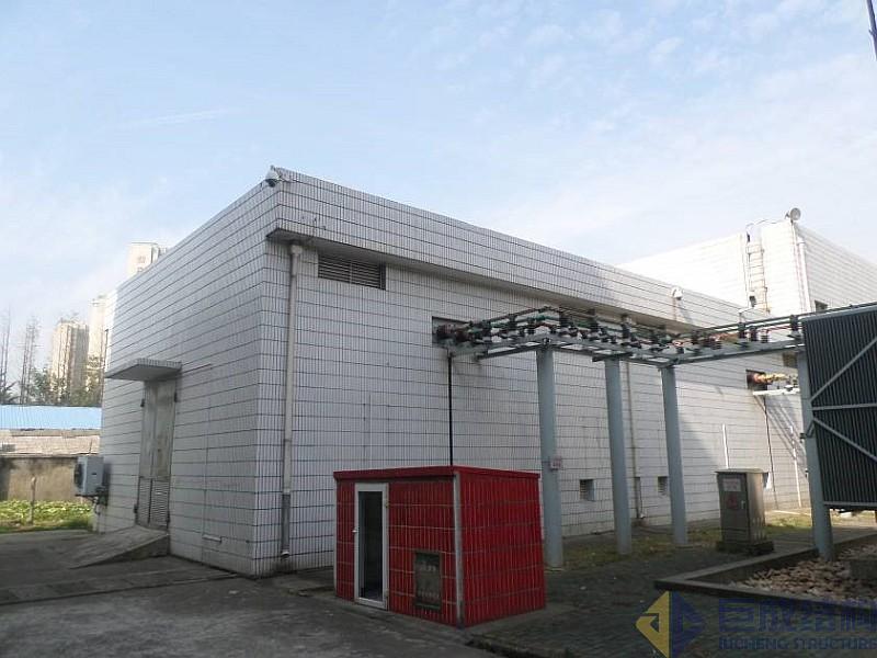 主控楼建筑平面呈菜刀形布置,建筑总长约37.3m,总宽约12.2m,主体结构为两层(南侧配电室为一层)框架结构,建筑总高约为11.1m,总建筑面积约594.1m2。主控楼一楼南侧为配电室,北侧为电容器室、杂物间及厨房,二楼为控制室及资料室。