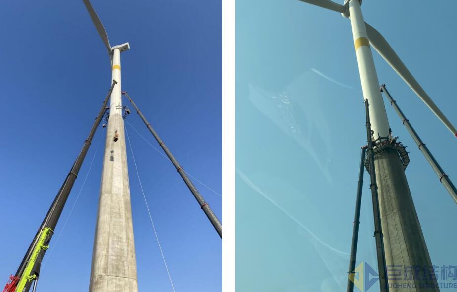 2021年初的寒潮相比往年更猛烈,sunbet申搏官方网站位于山东鄄城的施工场地达到零下18℃,滴水成冰,而疫情又在河北复燃。鄄城项目风机塔筒采用预应力混凝土与钢筒结合的组合结构形式,总高度140m,该创新体系在国内是首次使用,因此它的安全使用对于业主和行业的发展都有重要意义。sunbet申搏官方网站的任务是在春节前完成两个风机塔筒加固。
