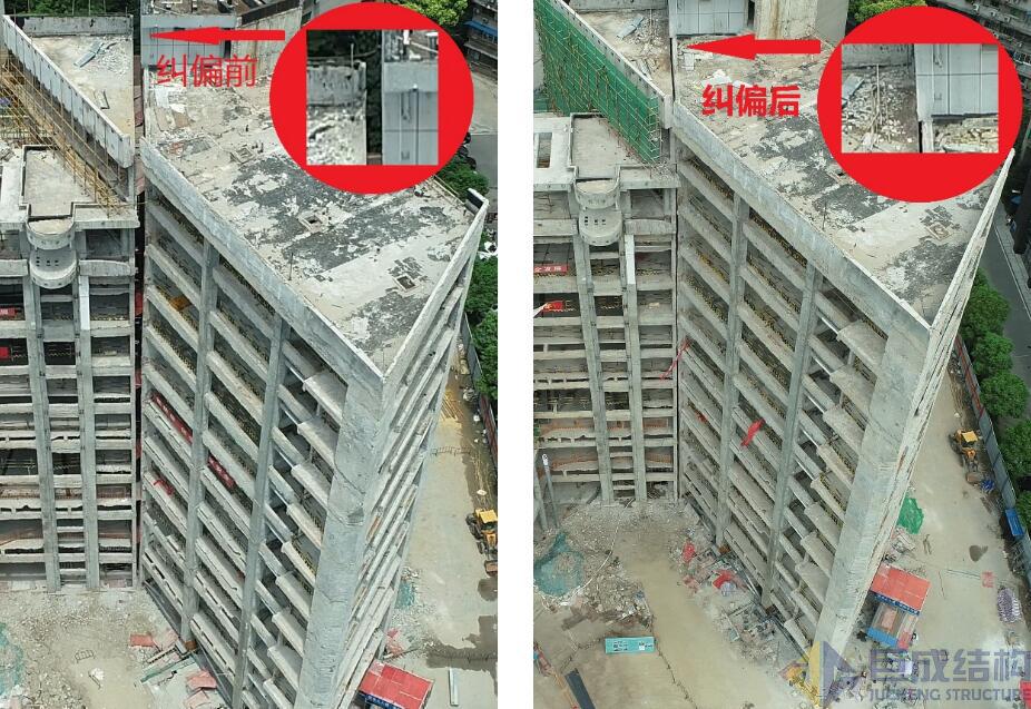 武汉科技馆老馆1区东楼顶升纠偏前后对比