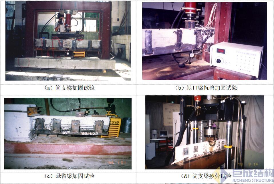 二十年来,sunbet申搏官方网站科研人员对粘接型钢加大截面加固法开展了相关理论分析、力学性能试验研究和数值分析,包括粘接型钢加大截面加固简支梁抗弯试验研究、粘接型钢加大截面加固缺口梁端部抗剪试验研究、粘接型钢加大截面加固悬挑梁抗弯试验研究、粘接型钢加大截面加固简支梁重载疲劳试验研究、粘接型钢加固混凝土板试验研究等(如图4),取得了丰富的研究成果,具有理论、试验研究分析和大量实际应用基础。