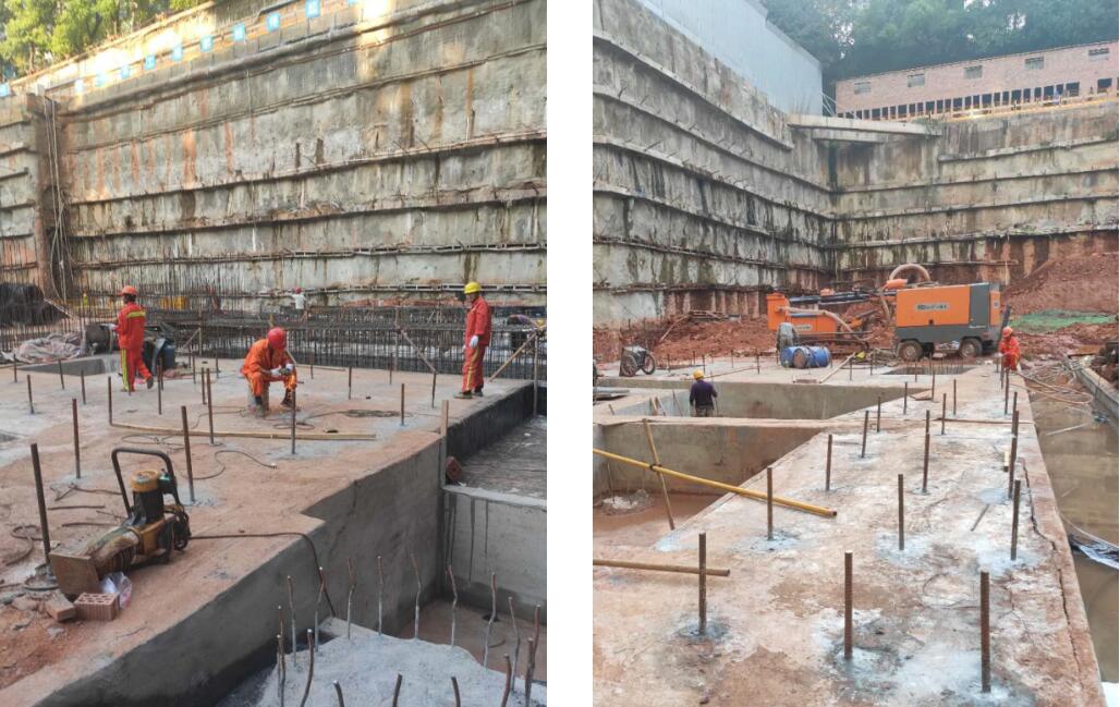 本工程于2019年~2020年实施,主楼下部负三层地下室,约4000平方米,原设计底板抗浮设计水位考虑不够,导致底板开裂漏水,本次方案按实际水头高度6m重新考虑抗浮,鉴于该项目地下室底板以下即为强度较高的中风化岩石,故采用自锁抗浮锚杆实施,单根锚杆承载力特征值300KN,总长度不小于6m,总数量为512根,总长度3072m。