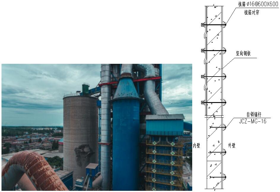该项⽬位于湖北省老河口⽔泥⼚内,厂内⽣料均化库建成于2009年。库容量为2万吨。该库于2009年正式投产,为⼀座单体圆形钢筋混凝⼟筒仓结构。该⽣料均化库库体外壁在2021年8⽉22⽇突然出现破洞损坏,钢筋裸露,破坏⾯积达到56m2,库体因内部压强突变,库顶板发⽣严重的内凹变形,与钢⼚房相连接钢构件受拉发⽣严重变形以及错位。应急处理⽅式中包括包钢板加固,包钢加固中采⽤⾃锁锚杆替代化学植筋后锚固。
