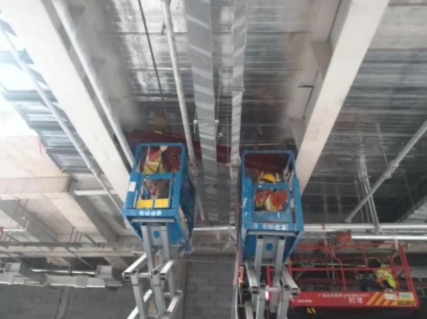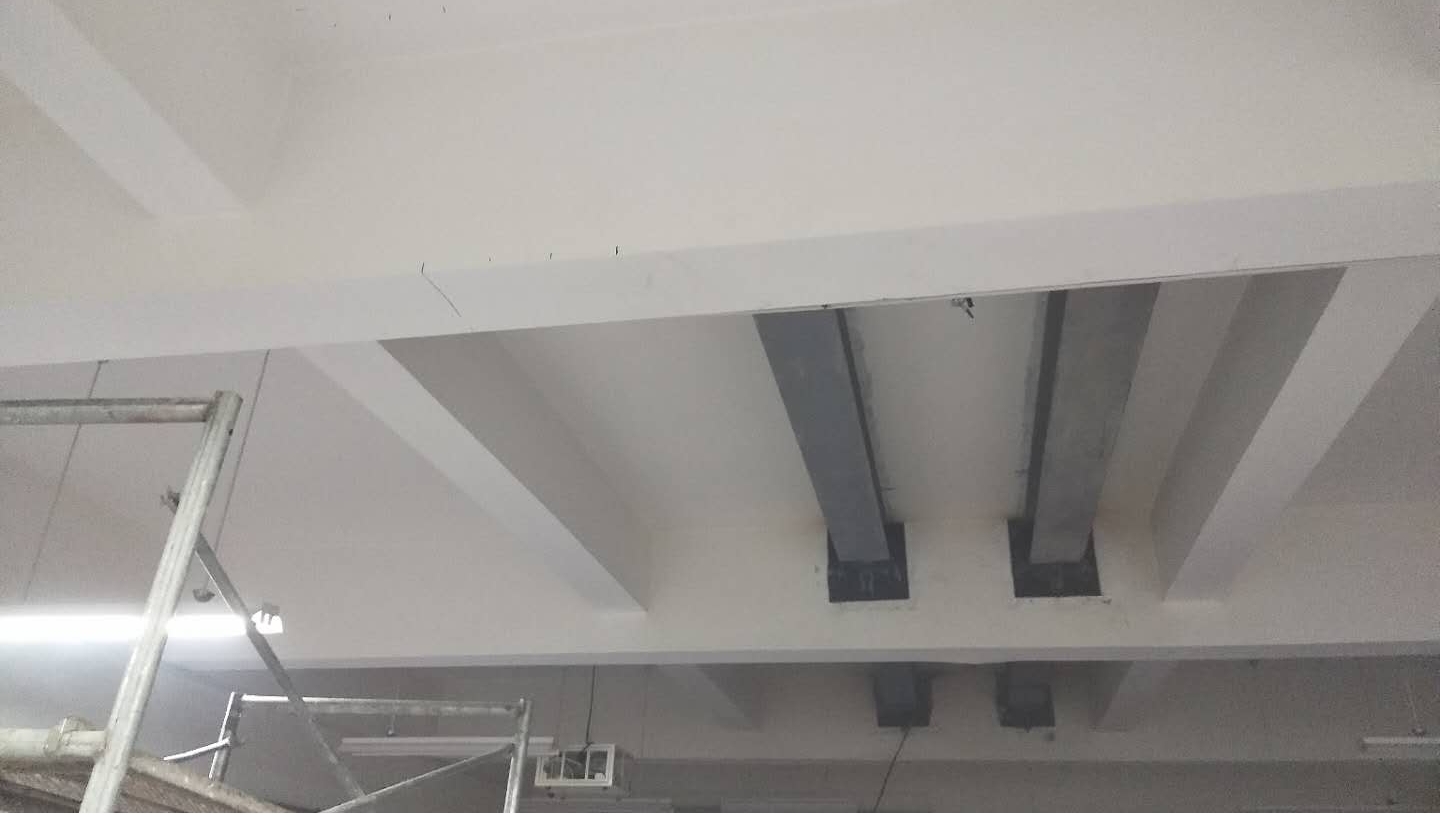⻓沙宜家购物中⼼项⽬因新增防⽕卷帘造成的楼⾯荷载增加,经加固设计,对混凝⼟板厚不满⾜设计要求处采⽤板下新增型钢结构加固处理。