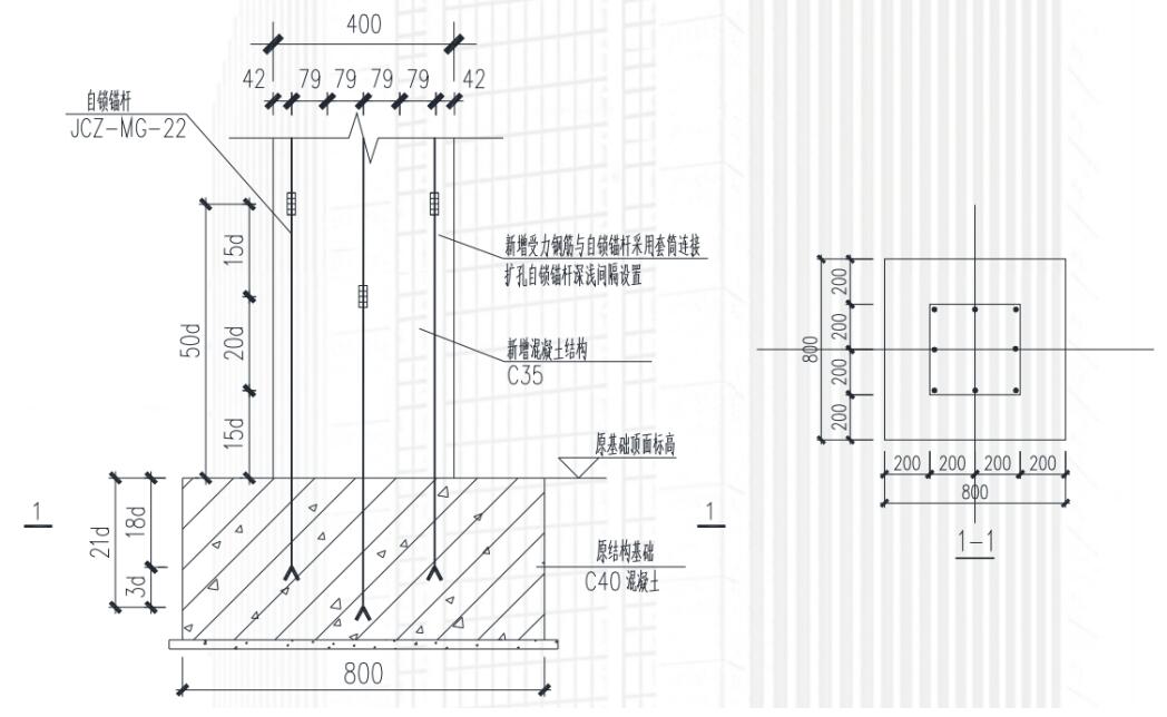 经改造加固设计,对经升级改造后的屋⾯结构、吊⻋梁、柱⼦进⾏了常规加固。原设计柱加固⾄⼚房基础顶⾯处(即室内地坪标⾼以下),由于地⾯处有设备影响开挖,⽆法实施。故调整设计⽅案:在不破除地坪前提下,⽤⾃锁锚杆从地坪打孔⾄基础顶⾯以下锚固深度,代替地⾯以下原加⼤截⾯受拉钢筋。