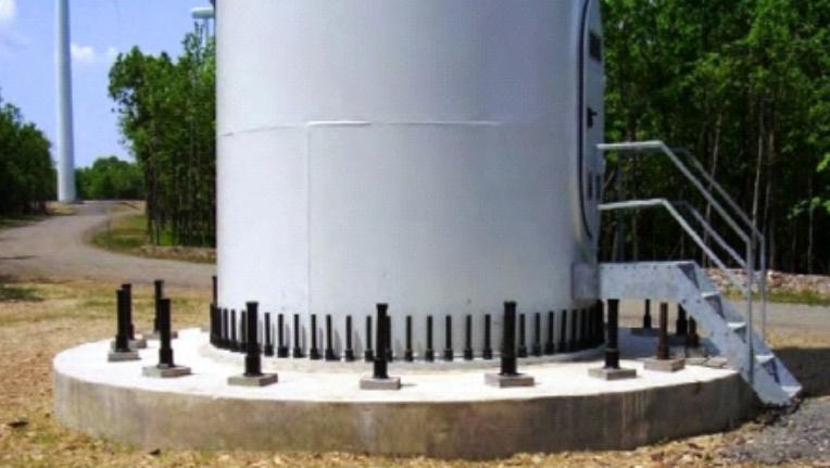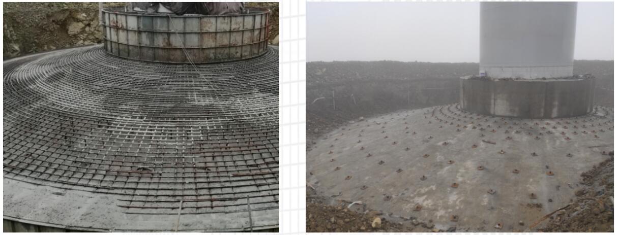 该⻛场发电机组共33台,装机总容量49.5MW。⻛机基础采⽤P&H岩⽯锚杆⻛机基础技术。项⽬于2013年12⽉30⽇投产发电,运⾏过程中发现部分⻛机基础原设计的18根50mm岩⽯预应⼒锚杆出现数量不等的断裂情况,经专家论证,原锚杆断裂主要是疲劳荷载导致。