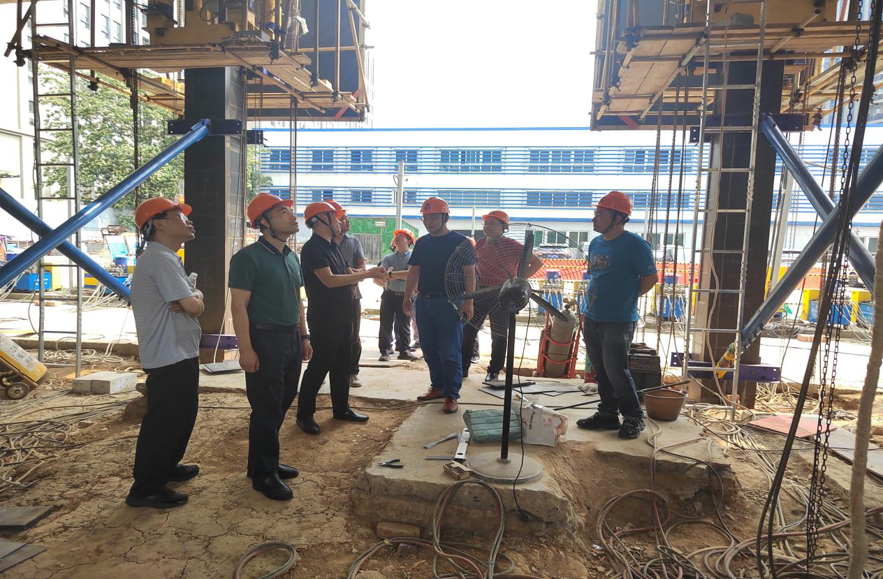 中轻武设李总一行来到sunbet申搏官方网站群控同步顶升工程试验项目现场,副总经理廖杰洪介绍了顶升试验内容和目的,并对群控同步顶升大型数控设备以及顶升原理等做了详细讲解。双方在现场展开了热烈讨论,并就试验过程中的相关技术要点进行了深入交流。
