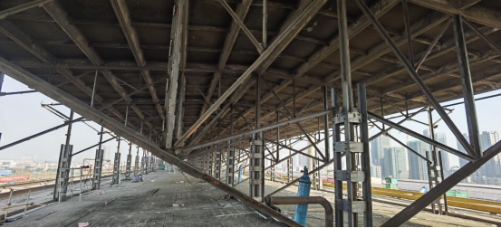 目前,项目部约有200人正紧锣密鼓地开展钢天窗架顶降的相关施工准备工作,如钢滑道安装、天窗架构件加固、纵横向支撑安装、设备安装调试等。