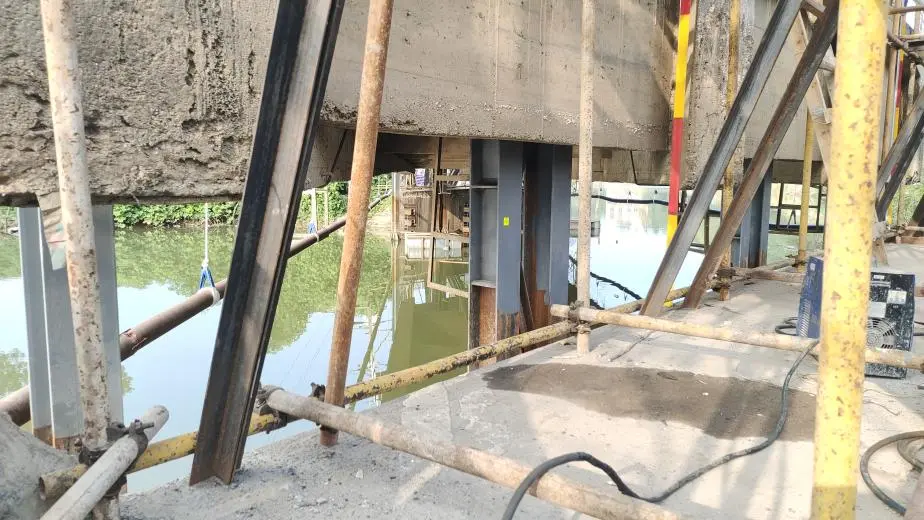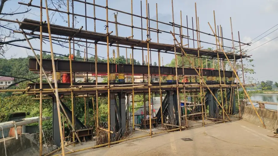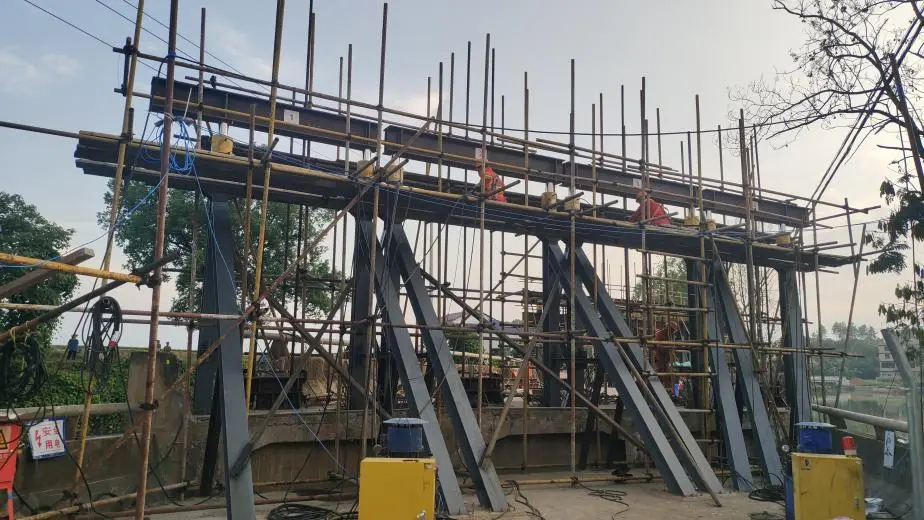 安全管控方面,项目部也做到了精准施策:采用“分段吊绳逐级放长”的方式确保河上桥两侧的光纤管、PE水管在顶升期间基本保持在原有的水平线上,实现断裂零风险。河上桥顶升完成后,进一步采取双重安全保障措施,利用48mm钢丝绳将桥段端梁与钢构体系的横梁捆绑,同时在原桥台上设置型钢立杆做好竖向支撑,确保后续桥下施作新桥墩桥台的空间安全。